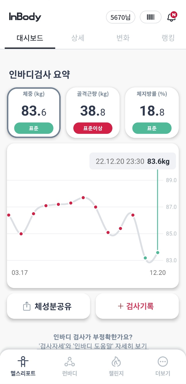 골격근 38.8에 체중 83.6으로 46%가 골격근 량이 되었다.